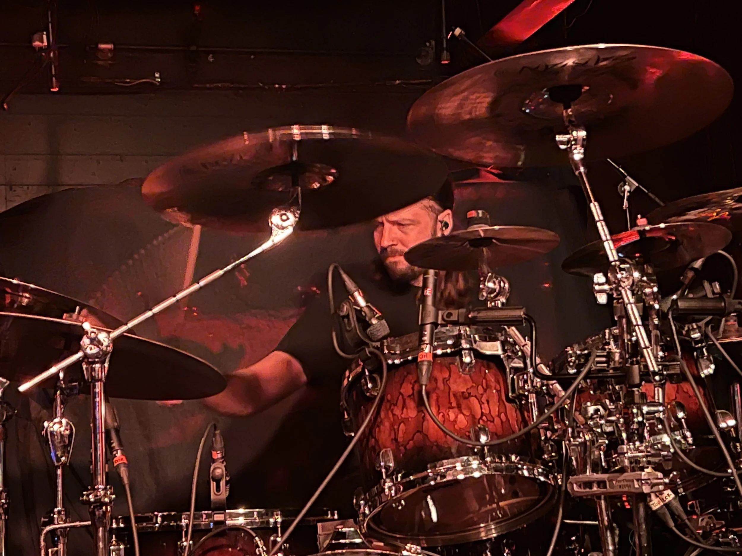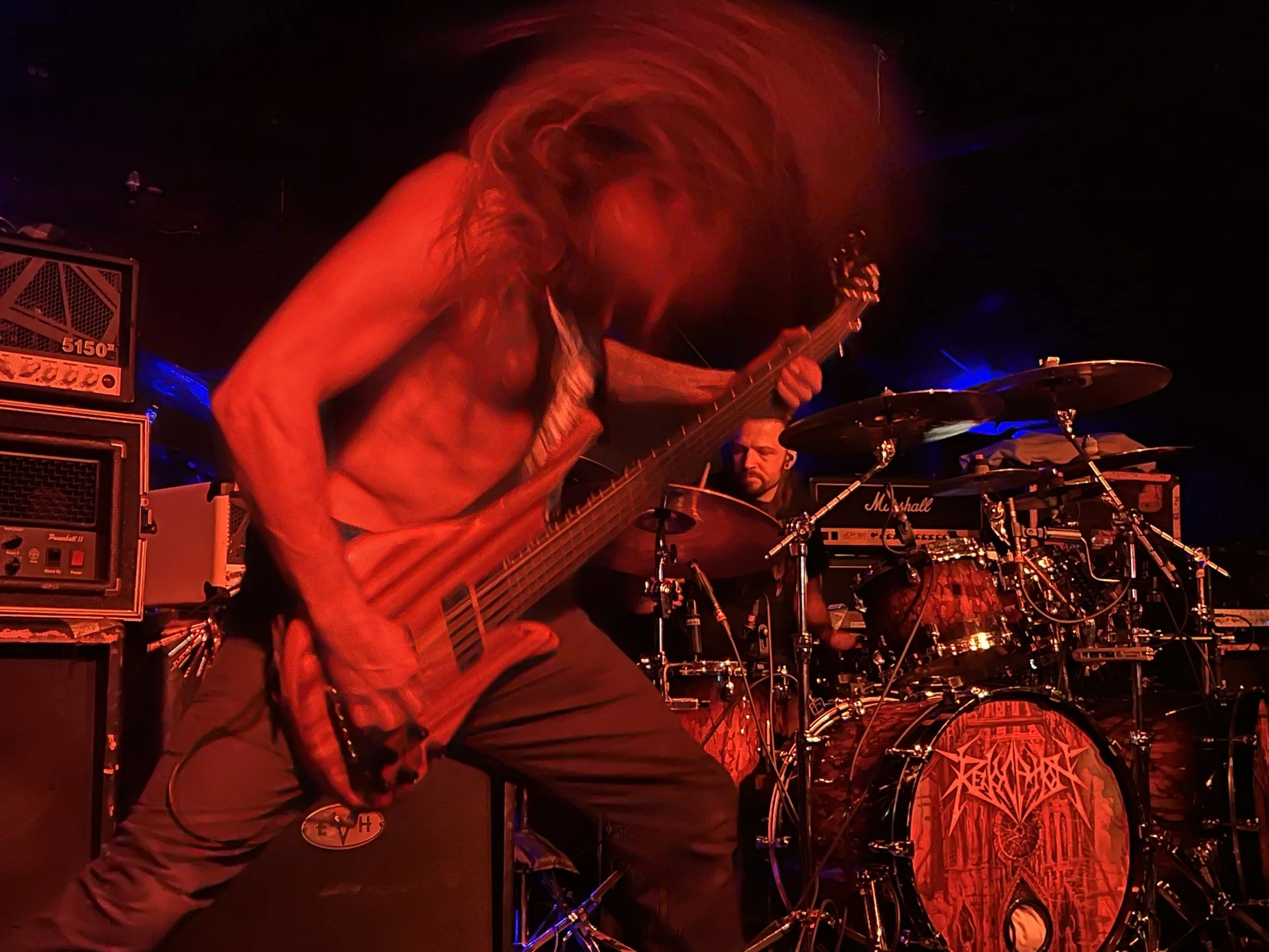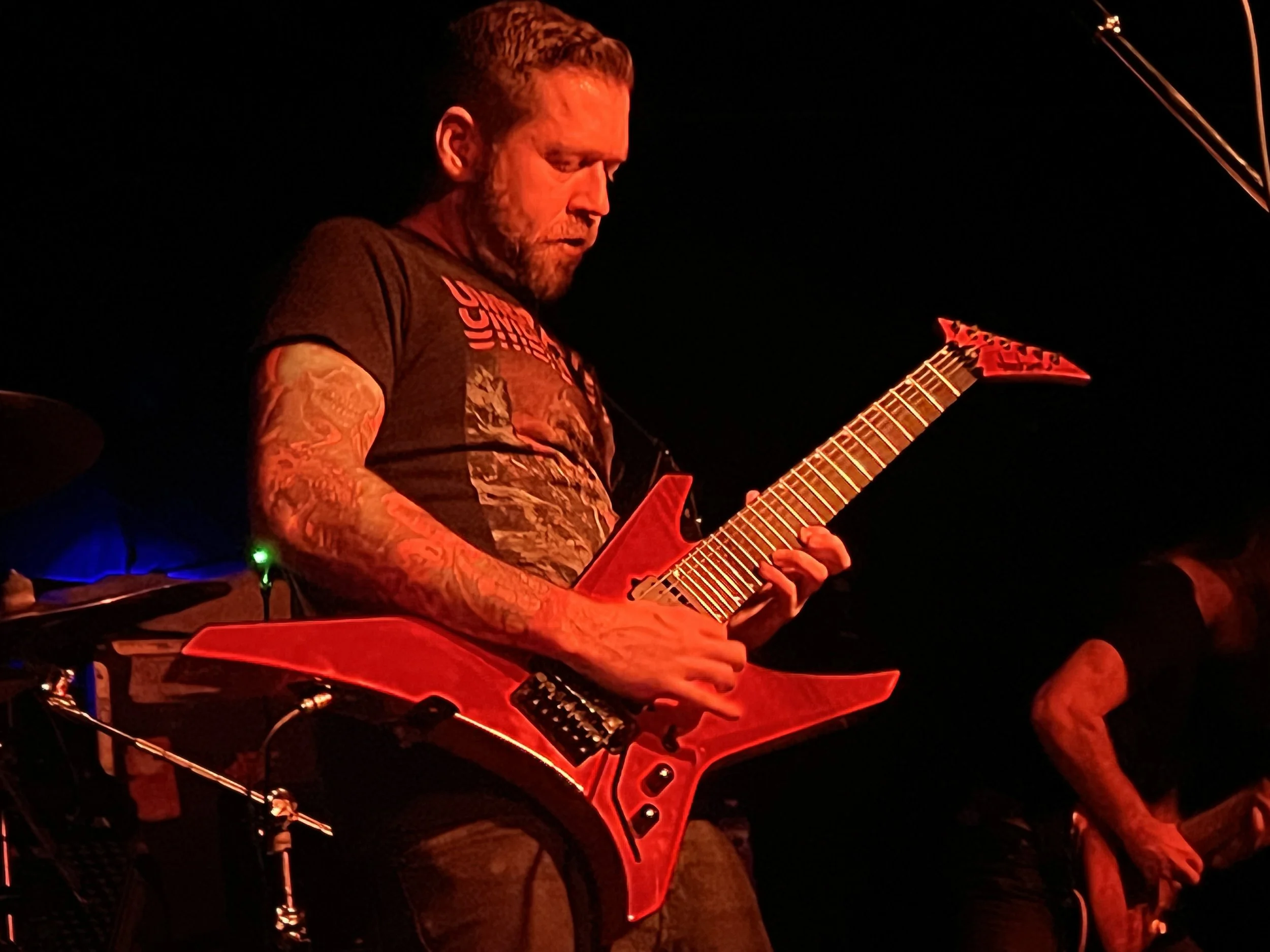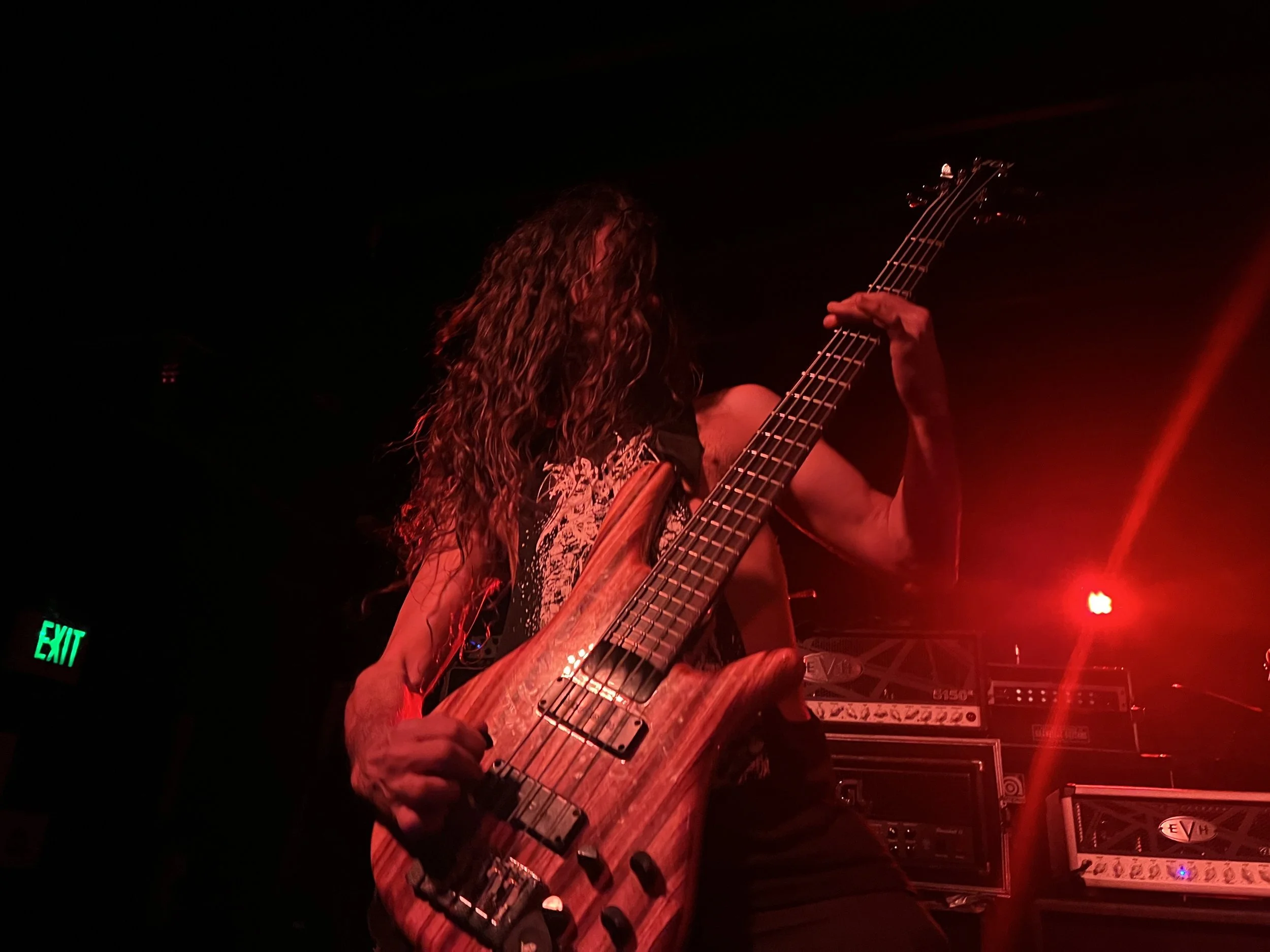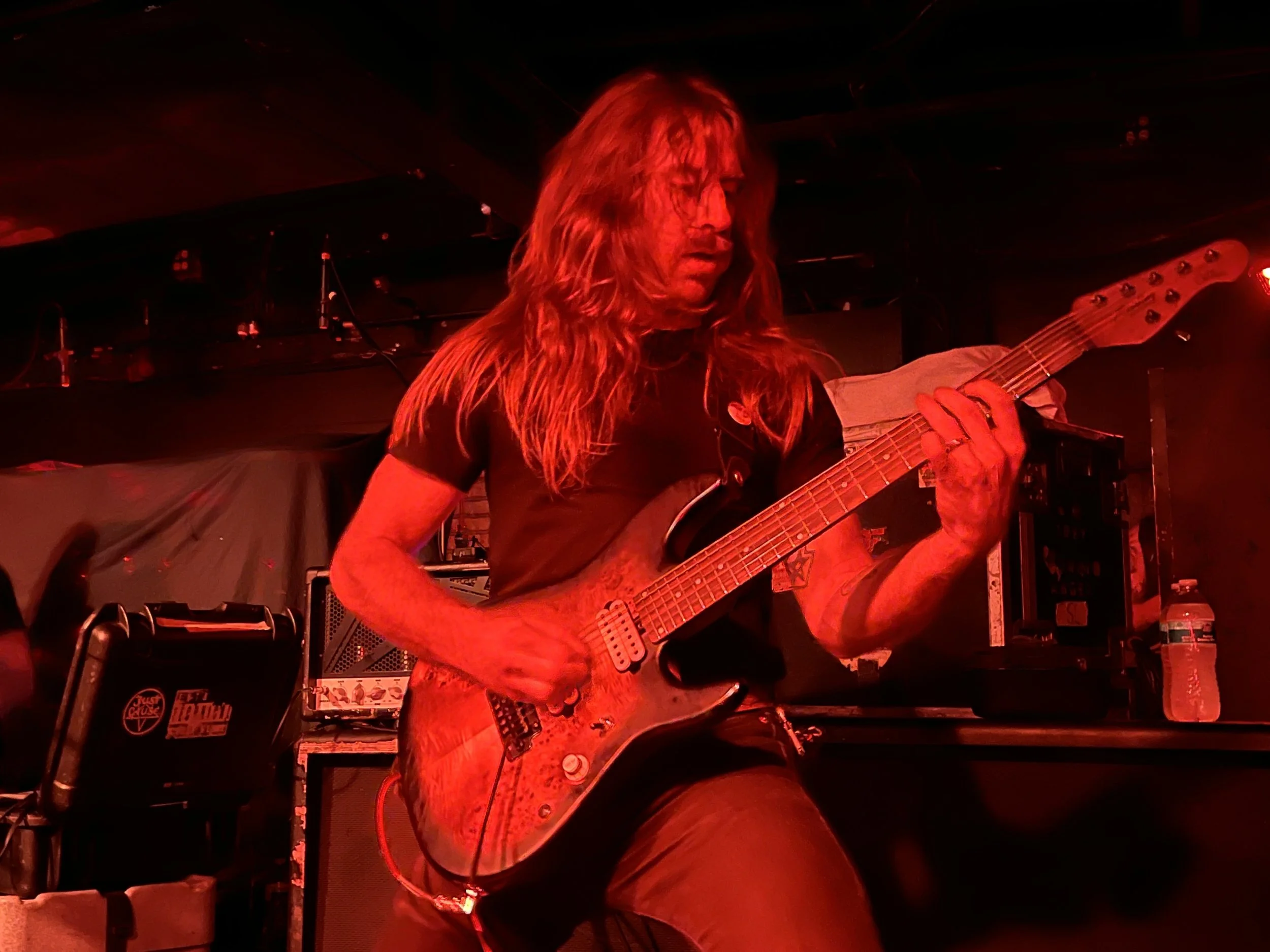 It’s certainly the sonic spectacle to see Dave play such an exquisite level of guitar-playing, capsulated with the demented, bizarre tempo changes accompanying the riffs, and still fluid as a noiseless, running river. The solo in “Of Unworldly Origin” can be sung, hummed, and professionally air-guitar played, note-for-note. The crisp sounding notes, minor key changes, stunning melody that stops on a dime, with a charcuterie plate of tasteful flavour, colourful dynamics, and a wicked amount of musical, powerful pressing passages. I’m honoured each time I can watch Dave Davidson perform and play guitar. Although Brent Bamberger’s Bass tone could have been louder in the mix, his aggressive windmills, headbanging, and rocking presence on-stage, more than made up for it.